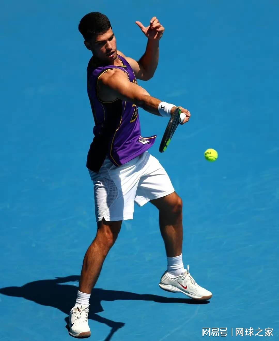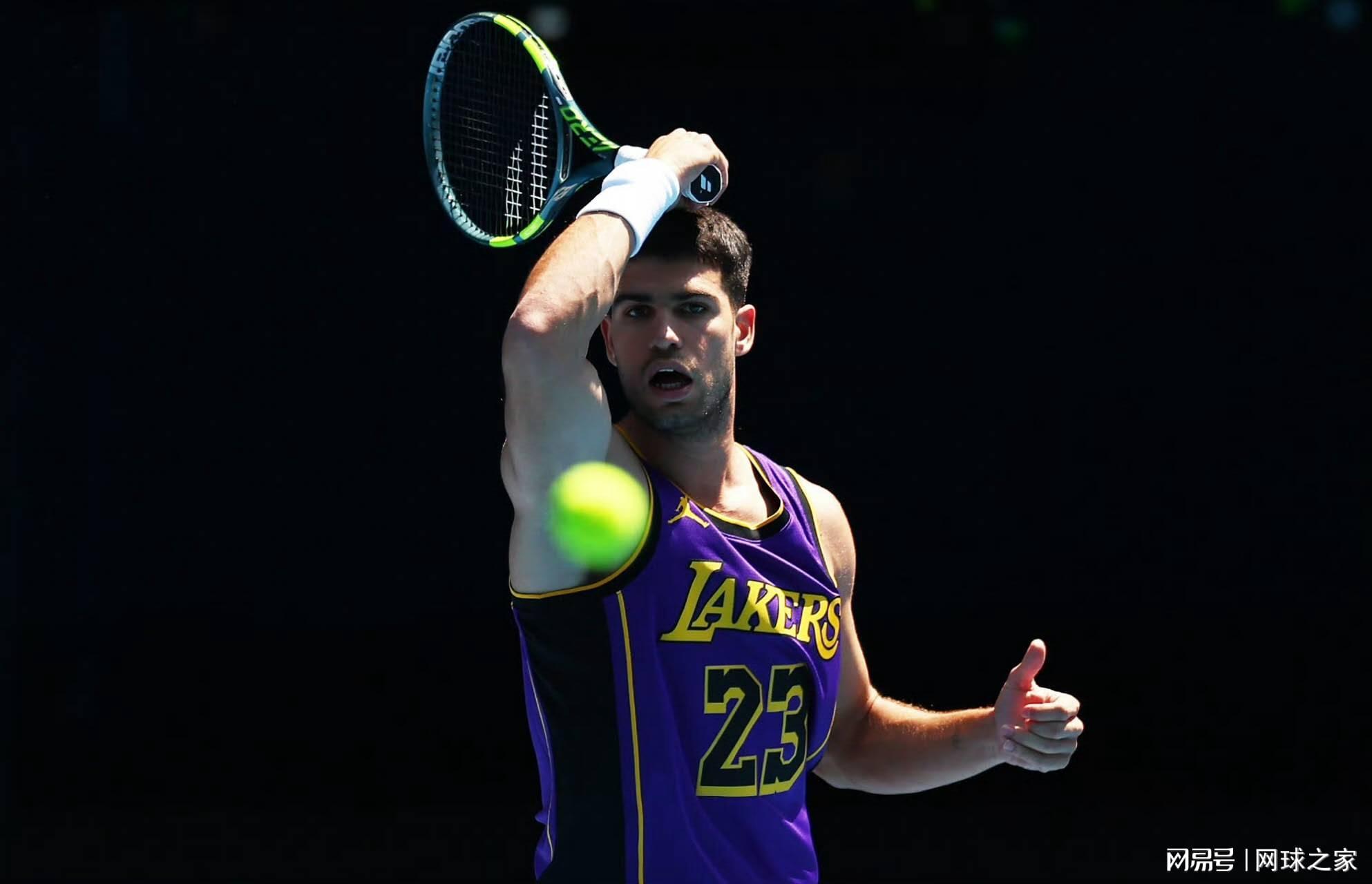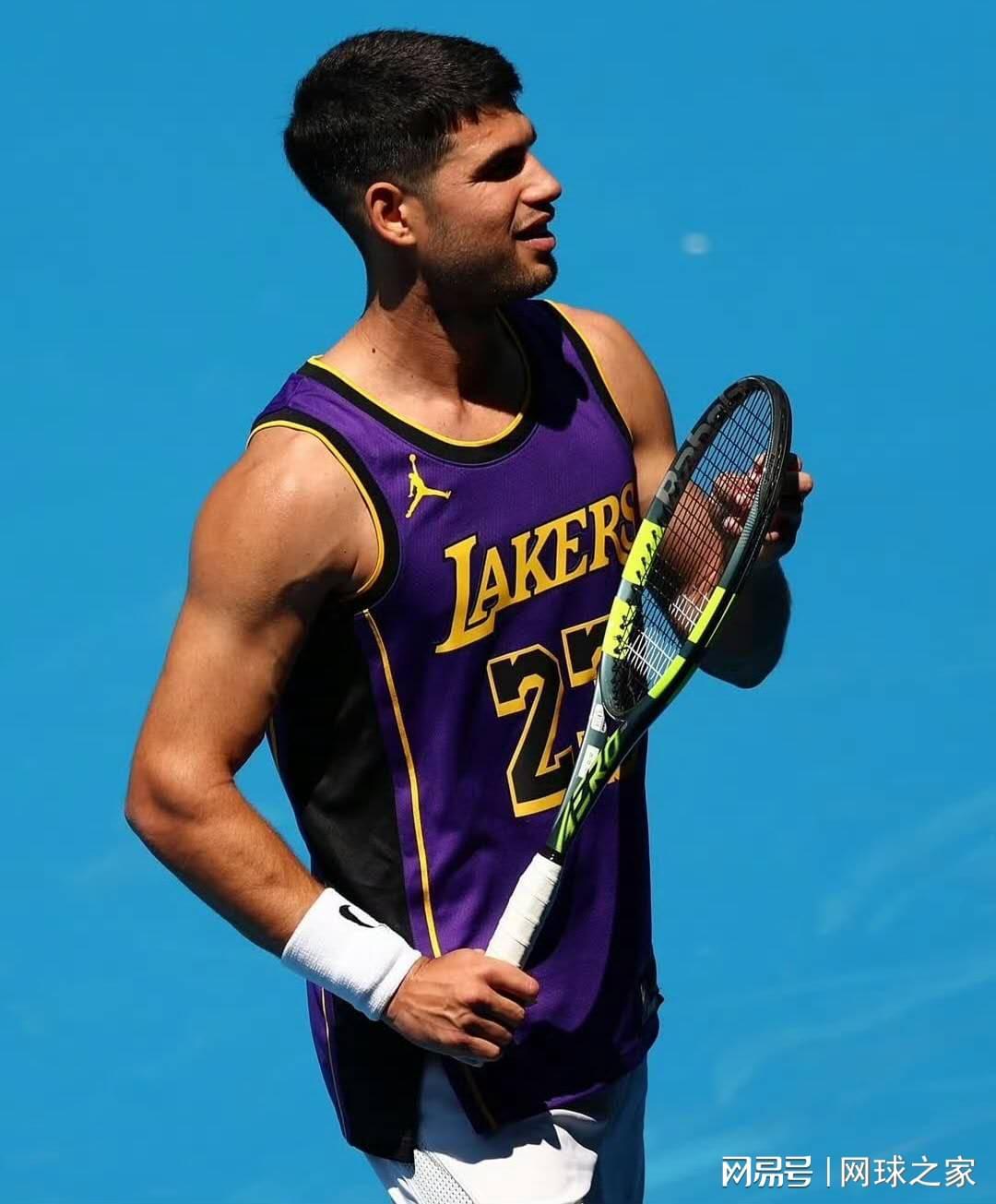 就在周杰伦宣布参赛的同一天,男单世界第一阿尔卡拉斯在澳网训练中的着装引发了另一波跨界热议。这位西班牙名将身穿勒布朗·詹姆斯的湖人队紫色23号球衣完成训练,澳网官方社交媒体账号也发布了这张照片。